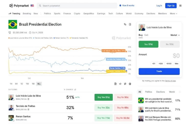Apesar da projeção de vitória, os números do petista pioraram desde o começo do mês. No dia 1º deste novembro, a aposta da Polymarket indicava 60% de chance de vitória de Lula, contra 22% de Tarcísio de Freitas. Renan Santos aparecia com 8,5%.