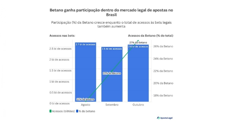 O salto culminou em um marco inédito: em outubro, a Betano se tornou a primeira casa de apostas da história a ultrapassar 600 milhões de acessos em um único mês, fechando com 719,9 milhões, o maior volume já registrado na história das casas de apostas no Brasil, segundo monitoramento exclusivo do Aposta Legal.