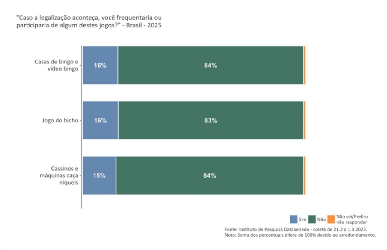 Bill No. 2,234/2022, which authorizes and regulates gambling, betting, and integrated resorts within national territory, remains under discussion in the Federal Senate. To support the analysis of Bill No. 2,234/2022, the DataSenado Institute conducted a national survey, requested by Senator Irajá (PSD/TO), interviewing over 5,000 Brazilians between February 21 and March 1, 2025.