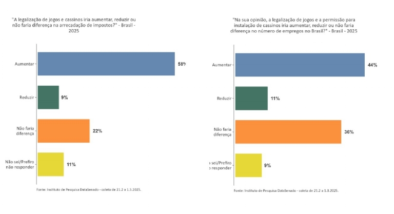 44% (75,822,521 people) of the population believe that legalizing gambling and allowing the establishment of casinos would increase employment in Brazil. Another 36% think it would make no difference, and 11% believe it could reduce employment.
