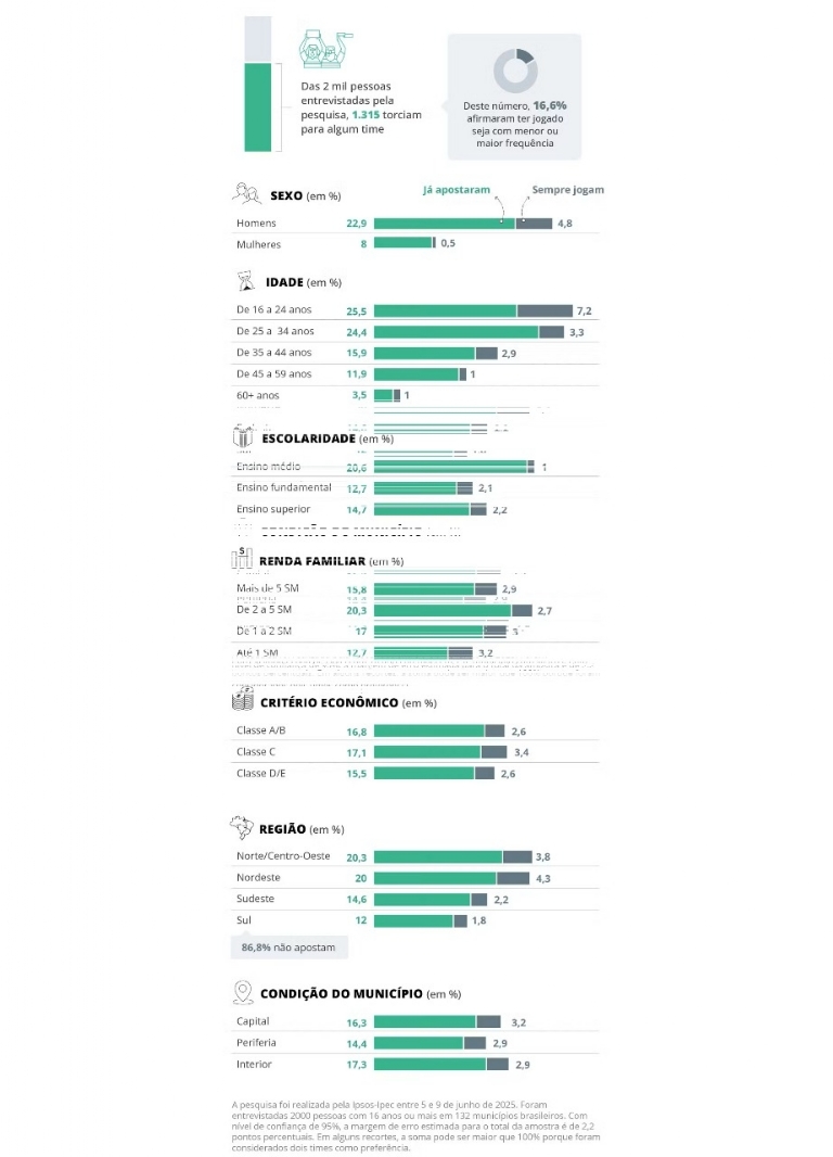 The survey was conducted by Ipsos-Ipec between June 5 and 9, 2025. Two thousand people aged 16 and over were interviewed across 132 Brazilian municipalities. With a 95% confidence level, the estimated margin of error for the total sample is 2.2 percentage points. In some breakdowns, totals may exceed 100% because respondents could choose two favorite teams.