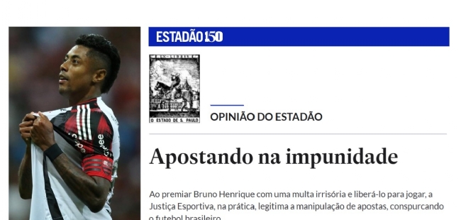 O jornal Estadão dedicou sua coluna de opinião ao caso Bruno Henrique após a decisão do Superior Tribunal de Justiça Desportiva (STJD) derrubar a punição imposta ao jogador do Flamengo por atos antiéticos. “Ao premiar Bruno Henrique com uma multa irrisória e liberá-lo para jogar, a Justiça Esportiva, na prática, legitima a manipulação de apostas e sinaliza que fraudes nas bets são desimportantes, conspurcando o futebol brasileiro”, afirma o duro texto.