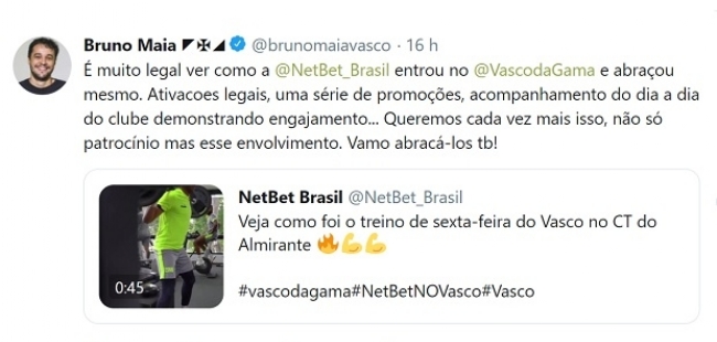 Em uma rede social, o vice-presidente de marketing do Vasco da Gama, Bruno Maia, destacou a grande participação que a NetBet vem tendo na parceria com o Gigante da Colina, fazendo boas ativações, muitas promoções e ainda acompanhando o dia a dia do Clube. Bruno Maia ainda disse que espera cada vez mais esse envolvimento com o Vasco, e pediu para que os vascaínos também abracem a empresa.