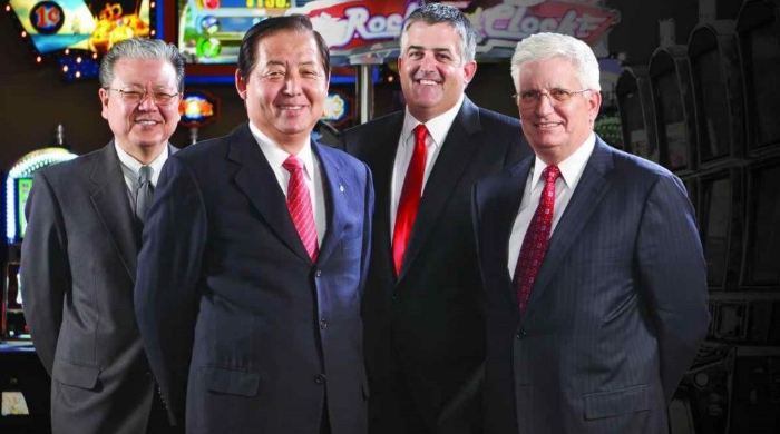 Satoshi Sakamoto, diretor executivo sênior da Konami, (segundo da direita para esquerda) e diretores da empresa.