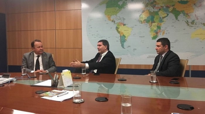 O deputado Goulart, David Zats (vice-presidente de relações institucionais e jurídicas do grupo Caesars) e André Feldman (executivo à frente da operação WSOP Circuit Brazil) em Brasilia. / Credito: Games Magazine Brasil