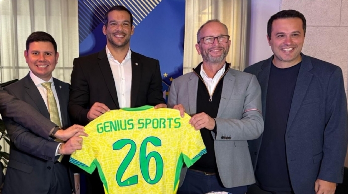 O presidente do GT de Arbitragem, Netto Góes, o presidente da CBF, Samir Xaud, Christopher Dougan, diretor de comunicação da Genius , e Guilherme Buso, responsável pela operação da Genius na América Latina.