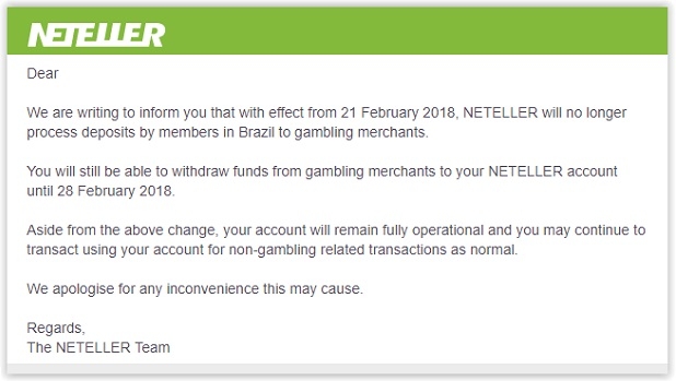 Prezado, Estamos escrevendo para informá-lo de que, com efeitos a partir de 21 de fevereiro de 2018, a NETELLER já não processará depósitos de membros no Brasil para comerciantes de jogos de azar. Você ainda poderá retirar fundos de comerciantes de jogos de azar para a sua conta NETELLER até 28 de fevereiro de 2018. Além da mudança acima, sua conta permanecerá totalmente operacional e você poderá continuar a fazer o processamento de sua conta para transações relacionadas ao jogo diferente do normal. Pedimos desculpas por qualquer inconveniente que isso possa causar. Saudações,Há muitas outras formas para depositar e sacar dinheiro das casas de apostas. Mas infelizmente não existe um serviço tão rápido quanto o do Neteller para fazer isso. A partir de agora os brasileiros podem buscar por outras boas opções, mas desde que as casas abram depósitos.
