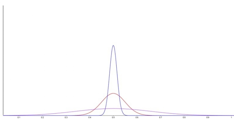 No entanto, se você aumentar o número de tentativas, a média pode ser aproximada, como uma variável aleatória normalmente distribuída. Em outras palavras, sua distribuição de probabilidade seria semelhante à curva em forma de sino ilustrada abaixo (simétrica em torno de 0,5).