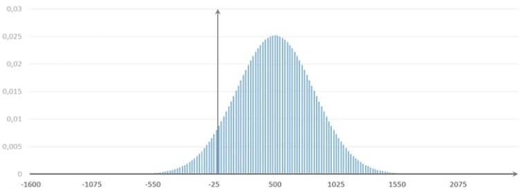 Por exemplo, esta é a distribuição de probabilidade de lucros diferentes após apostar em 1000 lançamentos da moeda com margem de 5% (odds 2.10):