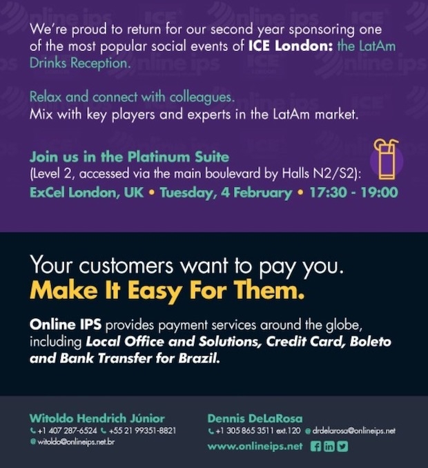 “Let's Meet... Let's Mingle...Let's Talk LatAm”. Assim a empresa convida a todos os interessados em passar um bom momento no primeiro dia do ICE London. A ideia é relaxar, conectar-se com colegas, misturar-se com os principais players e especialistas do mercado da América Latina.