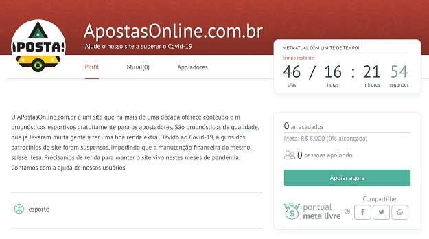 A campanha do ApostasOnline.com.br foi lançada há poucos dias através da plataforma apoia.se, que oferece um espaço online para buscar financiamento coletivo pra quem faz acontecer.