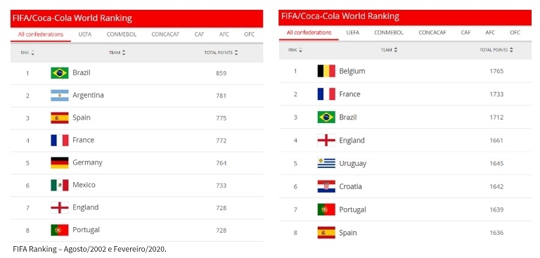 Avancemos 18 anos para o futuro: após 2002, o Brasil não chegou mais às finais da Copa do Mundo nas quatro edições subsequentes, perdeu de 7×1 para a Alemanha em 2014 e a maioria dos clubes de futebol está afundando em dívidas. A Inglaterra, por outro lado, consolidou a Premier League como a liga de futebol mais rica do mundo, desenvolveu seus regulamentos e profissionalizou a gestão dos clubes. No mais, a evolução da nova geração de jogadores ingleses dentro de campo é evidente: chegou às semifinais na Copa do Mundo de 2018, venceu o Campeonato Europeu Sub-19 e as Copas do Mundo de Sub-17 e Sub-20 em 2017.
