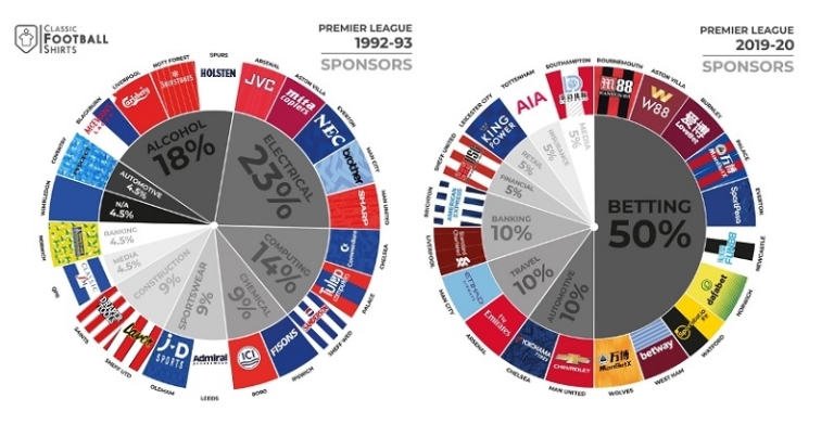 O desenvolvimento da indústria global de futebol nas últimas décadas mostrou como as empresas de apostas estão gradualmente dominando o mercado de patrocínios de clubes. Um exemplo que deixa isso claro é a evolução do patrocínio de camisas de clubes na Premier League inglesa de 1992 a 2019:
