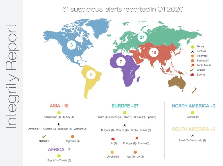 Tênis e futebol foram responsáveis por 49 alertas no primeiro trimestre, representando 80% do total geral. Os casos relatados sobre futebol no primeiro trimestre de 2020 dobraram para 18, em comparação com os nove relatados no quarto trimestre de 2019.