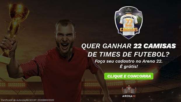 Para concorrer, é necessário acessar a página da promoção (https://arena22.com.br/promocao), seguir as orientações e responder à pergunta: Qual é o site de torneio entre amigos que te dá 22 camisas oficiais de futebol?
