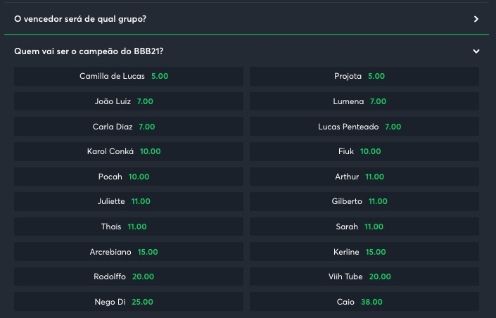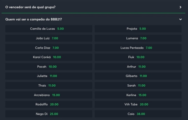 Para quem se interessou em fazer as apostas e tentar prever o vencedor do Big Brother Brasil, a lógica é muito simples. Cada cotação (odds) é o valor do multiplicador do dinheiro para quem quiser apostar. Sendo assim, se optar por apostar que o Projota, por exemplo, vai ser o vencedor, com odds de 5.00, significa que cada real apostado será multiplicado por 5. Se apostar 100 reais nessa opção e o rapper realmente vencer o programa, o apostador ganhará, no final das contas, 500 reais. A lógica funciona sucessivamente para cada participante, e quanto menos favorito ele for, maior será essa cotação.
