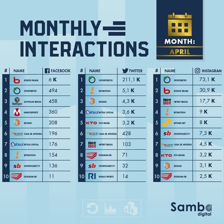 A análise da Samba incluiu 16 contas de apostas esportivas, todas com perfis portugueses estabelecidos em três grandes plataformas de mídia social: Instagram, Facebook e Twitter. Em abril, todos os 16 perfis do Instagram geraram um total de 164,2 mil interações.