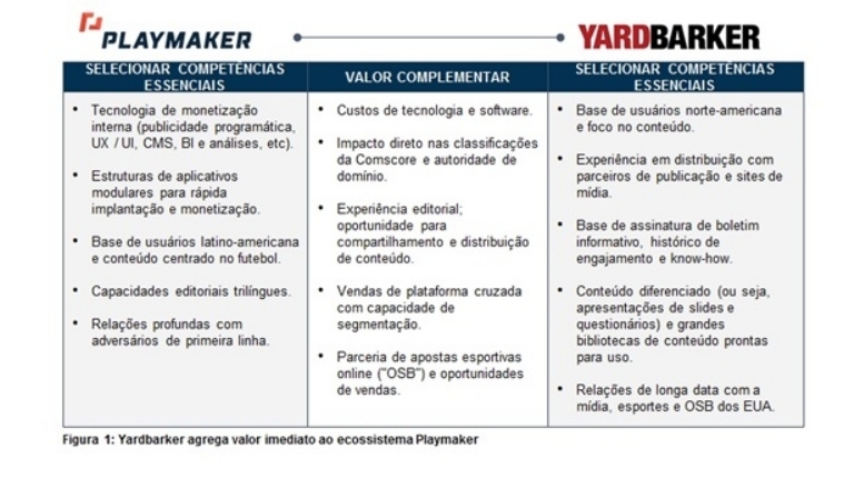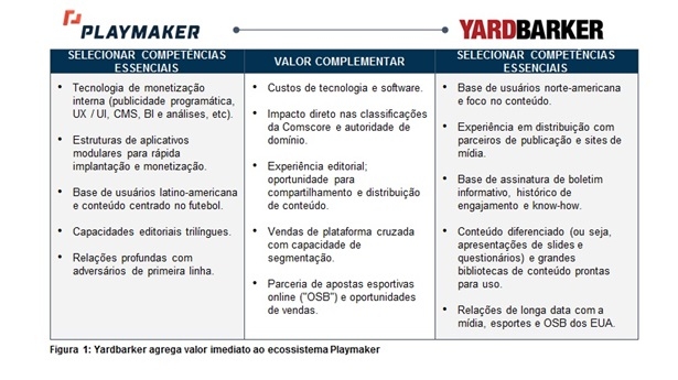 Sob os termos do contrato de compra de 26 de julho de 2021, a Playmaker adquiriu 100% da Yardbarker por um valor total de até US$ 24 milhões. A contraprestação do preço de compra consistiu no pagamento de US$ 10 milhões em dinheiro e na emissão de US$ 8 milhões em ações comuns da Playmaker (as "ações iniciais") no fechamento, e um adicional de US$ 2 milhões em ações comuns da Playmaker (as "ações contingentes"), que serão emitidas a favor dos vendedores após a Yardbarker atingir um EBITDA mínimo de US$ 1,5 milhão em 12 meses após o fechamento, e até US$ 2 milhões a pagar aos vendedores com base no rendimento da Yardbarker em direção a uma meta de EBITDA de US$ 2,5 milhões em cada um dos dois anos.
