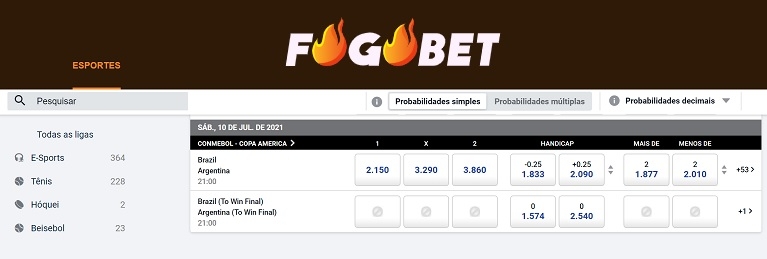 As casas de apostas já previam a final entre o Brasil e a Argentina antes mesmo do início do campeonato e apontavam em suas quotas uma realidade que foi se confirmando jogo a jogo e culminou no Super-Clássico entre os dois mais importantes times de futebol das Américas.