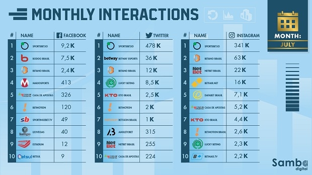 O pico de interações da Betano, em julho foi obtida em um concurso que ela ofereceu aos torcedores do Atlético-MG. Na ocasião, eles puderam votar na foto que se tornaria um mosaico na arquibancada. A ação gerou cerca de 10 mil interações.