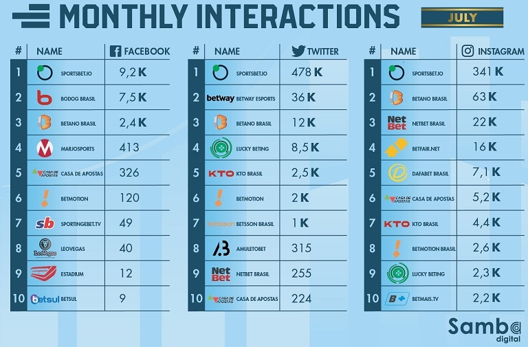 O Betmotion aparece nos três rankings elaborados pela Samba Digital. A casa de apostas já tradicional do mercado brasileiro, está em 6º no Facebook e Twitter, enquanto aparece em 8º no Instagram.