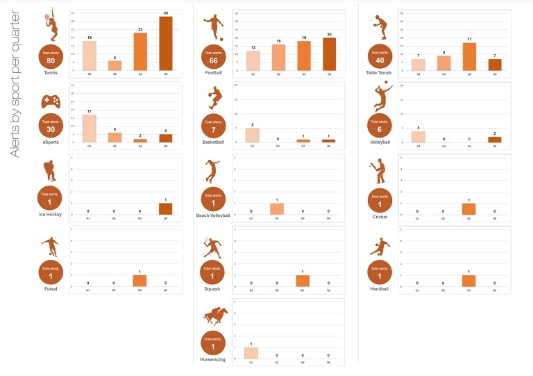 O número de 2021 é compatível com os últimos anos, com o número médio de alertas anuais em 240 durante 2018-20. Os alertas de 2021 abrangeram 13 esportes e 49 países diferentes, com o tênis e o futebol continuando a dominar. A Europa também continuou a fornecer o maior número de alertas, com 50% do total anual.