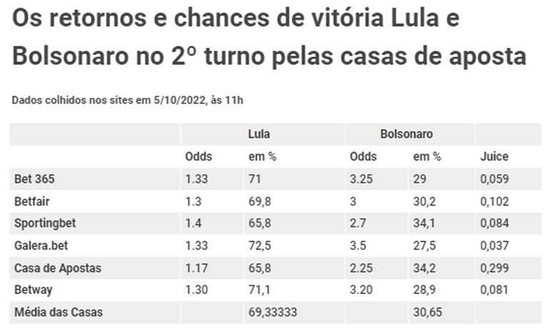 Um levantamento feito por VEJA com seis casas de aposta com o auxílio do professor Fábio Machado, chefe do departamento de Estatística do Instituto de Matemática e Estatística da USP, com dados disponíveis nos sites nesta quarta-feira, 5, às 11h, mostra uma porcentagem de chance aproximada para cada candidato, de acordo com as estimativas dos apostadores. Ele mostra que, em média, elas veem Luiz Inácio Lula da Silva com 69,3% de chance de vitória no segundo turno contra 30,6% de Jair Bolsonaro.