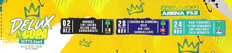 A Delux na Copa F12.Bet está confirmada nos dias 24, 28 e 02 de dezembro, na Arena F12, localizada no Pina, com mega estrutura para que os recifenses possam assistir aos jogos ao vivo e em seguida curtir shows de grandes artistas, como Mari Fernandez, Vitor Fernandes, Tarcísio do Acordeon, Dj Deb Lima, Lipe Lucena e muito mais.