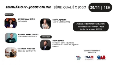 Com a proximidade da votação do marco legal dos jogos eletrônicos e fantasy games no Senado, a OAB/DF coloca no ar mais um episódio da série “Qual é o Jogo”. Rafael Marcondes (Rei do Pitaco), Fabíola Jaeger (Caleta Gaming), Natália Nogues (Control+F5) e Luiza Malheiro (advogada) serão moderadas por Filipe Senna, secretário-geral adjunto na entidade.
