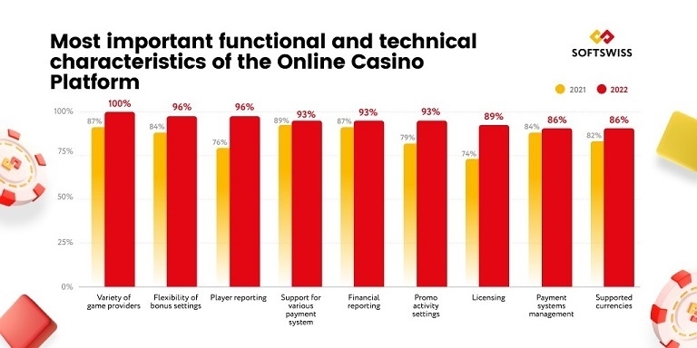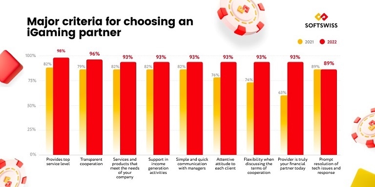 Os resultados da pesquisa mostram que as prioridades do cliente na escolha de um parceiro de negócios e produtos de plataforma de cassino estão mudando de acordo com as tendências gerais de negócios e da indústria. Consideravelmente mais destaque agora é dado à comunicação baseada em confiança e rapidez, flexibilidade na parceria, bem como compromisso inabalável com o nível de serviço superior. Quanto às expectativas de produtos, as operadoras buscam diversidade em portfólios de jogos, ferramentas e recursos de gamificação, disponibilidade de vários sistemas de pagamento e análises profundas em finanças e comportamento do cliente.