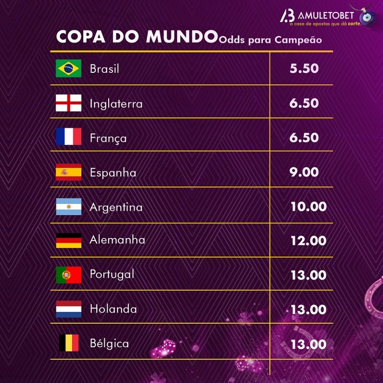 Inglaterra (6,5) e França (6,5), no entanto, estão bem próximas do time verde-e-amarelo nas cotações. O grupo dos principais favoritos ainda tem Espanha (9,0), Argentina (10,0), Alemanha (12,0), Portugal (13,0), Holanda (13,0) e Bélgica (13,0).