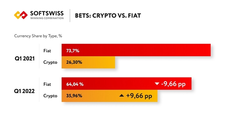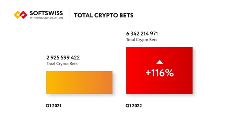 Juntamente com a tendência global, que mostra a crescente popularidade das criptomoedas, o relatório corporativo da SOFTSWISS também demonstra o desenvolvimento contínuo do cripto jogo. De acordo com as estatísticas, a soma das apostas em moedas digitais no primeiro trimestre de 2022 mais que dobrou em relação ao mesmo período do ano passado. Mais precisamente, cresceu 116,7%.