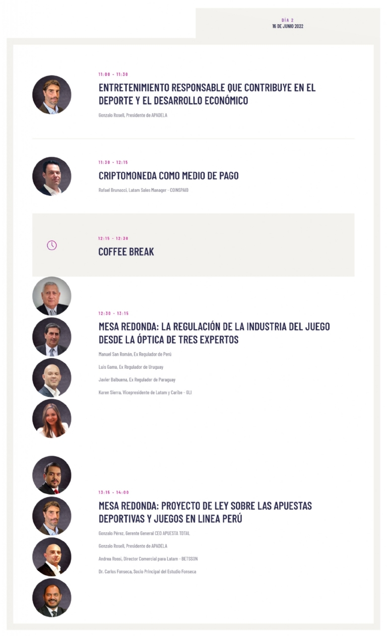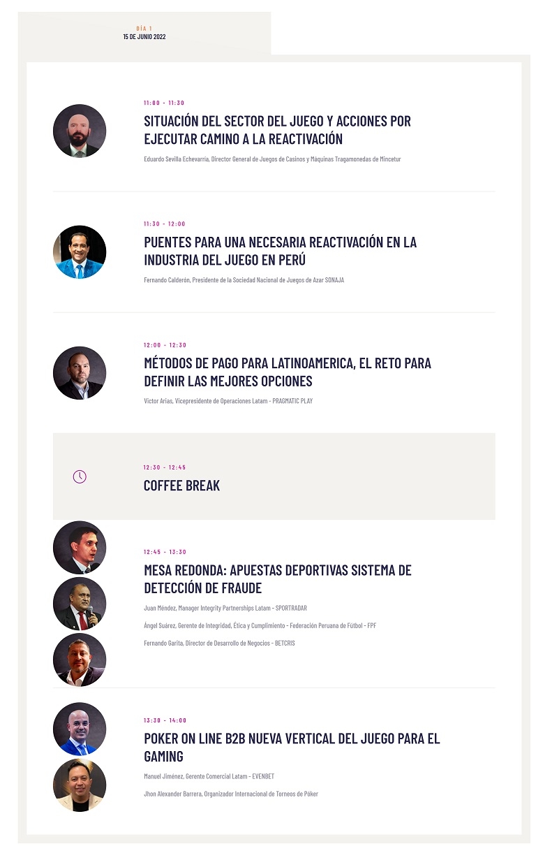 No primeiro dia do evento (15 de junho) especialistas farão uma apresentação sobre o "Sistema de detecção de fraudes" na área do esporte, especificamente em relação às apostas esportivas. O painel será formado por Juan Méndez, gerente de parcerias de integridade Latam da Sportradar, e Ángel Suarez, gerente de integridade, ética e conformidade da Federação Peruana de Futebol (FPF). O moderador será Fernando Garita, diretor de desenvolvimento de negócios da Betcris.