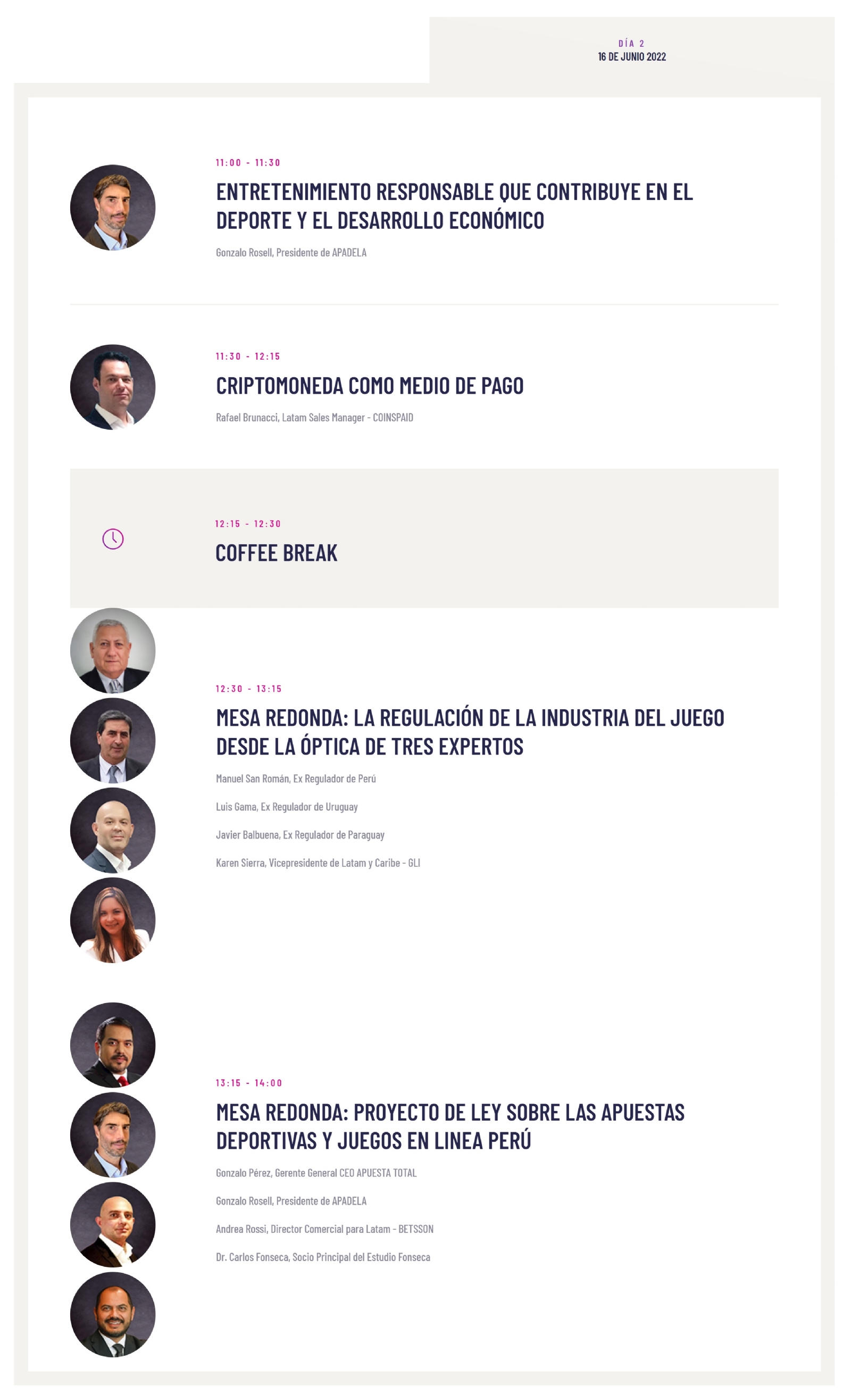 Durante o segundo dia (16 de junho) serão discutidas as criptomoedas, uma questão muito atual e importante, pois se tornaram um instrumento que irá acelerar as transações em todas as atividades econômicas e em particular no setor de jogos. O assunto de grande interesse ficará a cargo de Rafael Brunacci, gerente de vendas para América Latina da CoinsPaid.