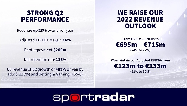 A Sportradar AG atualizou sua orientação anual, prevendo receitas para o ano inteiro na nova faixa de € 695 a € 715 milhões, um crescimento de 24% em relação aos resultados fiscais de 2021. O grupo listado na Nasdaq dos EUA capitalizou fortemente a expansão do mercado durante 2022, já que as receitas do segundo trimestre em todos os segmentos continuam a crescer, embora com custos e despesas crescentes.