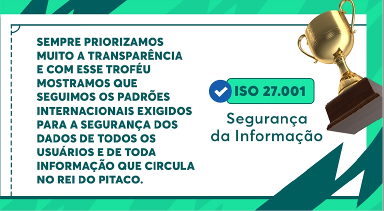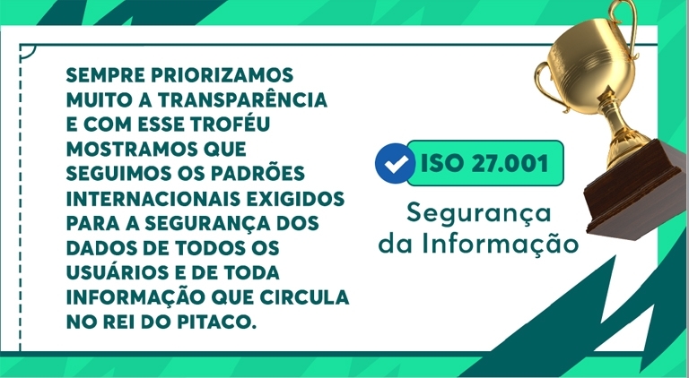 ISO 27.001: Certificação de Segurança da Informação. Considerando a natureza tech e a cultura de dados, essa é uma certificação importante, pois garante o atendimento dos padrões internacionais exigidos para segurança de dados de usuários e de toda a informação que circula no Rei do Pitaco.