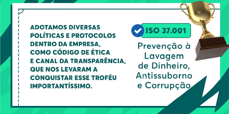 ISO 37.001: Certificação do sistema de Prevenção à Lavagem de Dinheiro, Antissuborno e Corrupção. Nesse caso, a empresa foi auditada e certificada quanto à adoção de todas as medidas necessárias para prevenir esses atos de ilícitos, treinando seus colaboradores no combate a práticas irregulares, implementando políticas internas, canal da transparência e procedimentos de Know Your Customer, Know Your Partner e Know Your Employee.