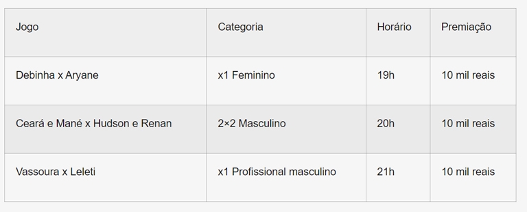 Na ocasião, haverá disputas nas categorias feminino, 1×1 profissional e de 2×2, todas valendo a premiação de 10 mil para os campeões. Confira a programação: