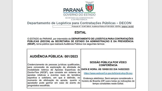 A Audiência Pública 001/2023 lançada pelo Governo do Estado do Paraná visa ao credenciamento de pessoas jurídicas qualificadas, para concessão da exploração das apostas esportivas. A sessão pública por videoconferência acontecerá no dia 14 de fevereiro às 10 horas (horário de Brasília) no endereço https://www.webconf.pr.gov.br/b/and-ohg-0ti-oxy.