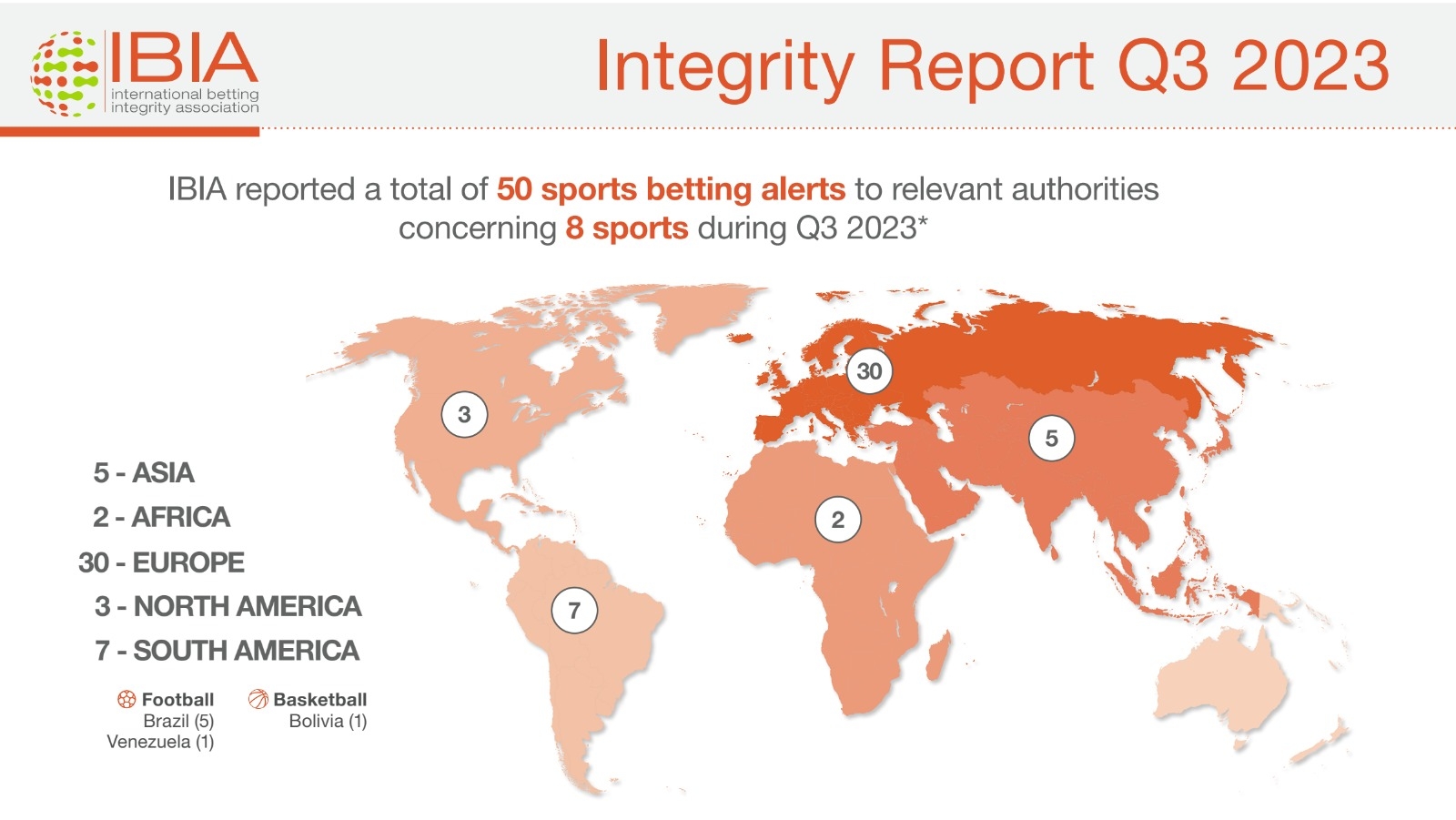 Os 50 incidentes de apostas suspeitas no terceiro trimestre envolveram oito esportes, em 21 países e cinco continentes. A América do Sul registra 7 casos no total dos quais 5 correspondentes ao futebol brasileiro. No trimestre anterior, foram relatados 4 casos referentes ao Brasil. Em seguida aparece um alerta do futebol da Venezuela e um do basquete da Bolívia.
