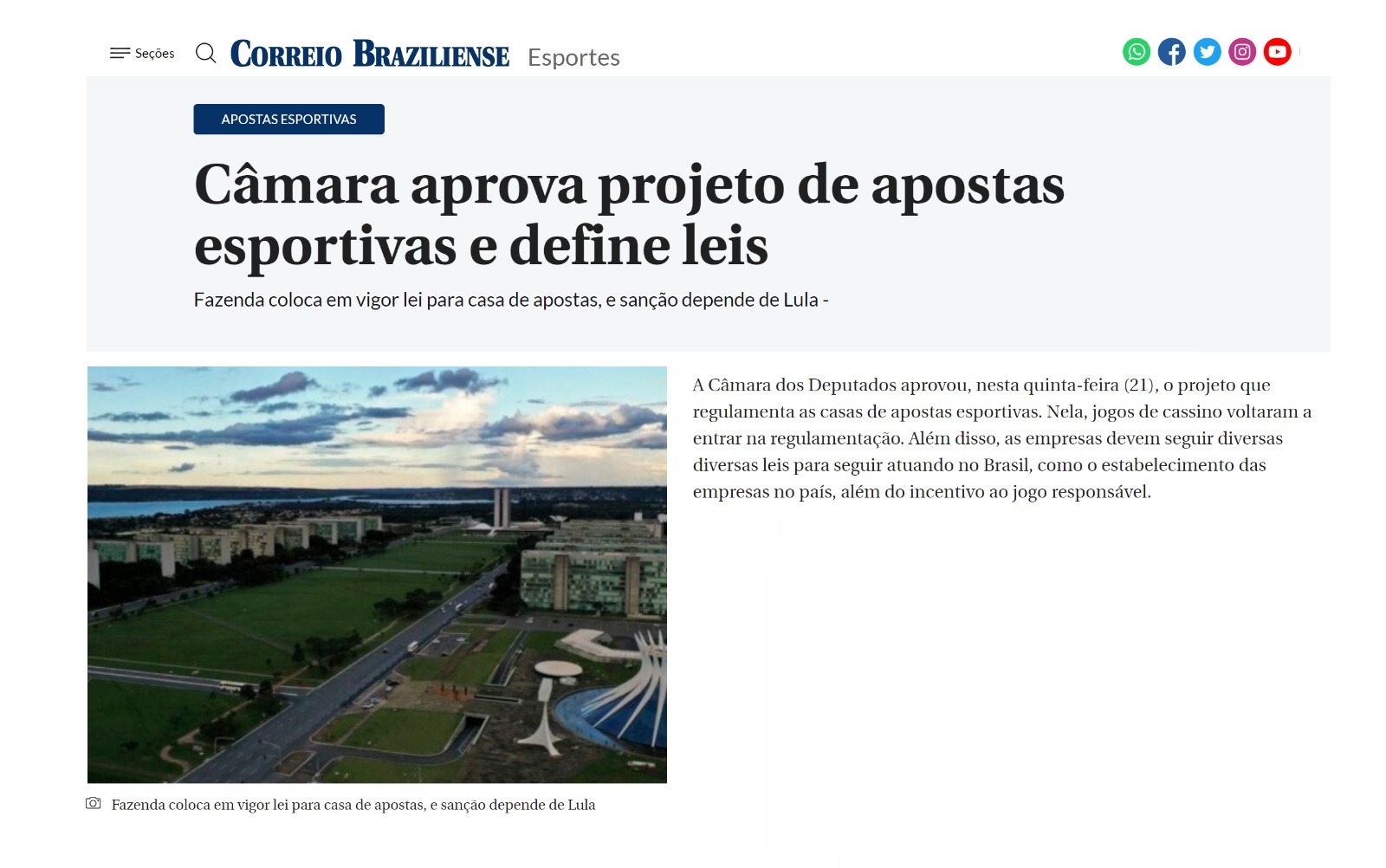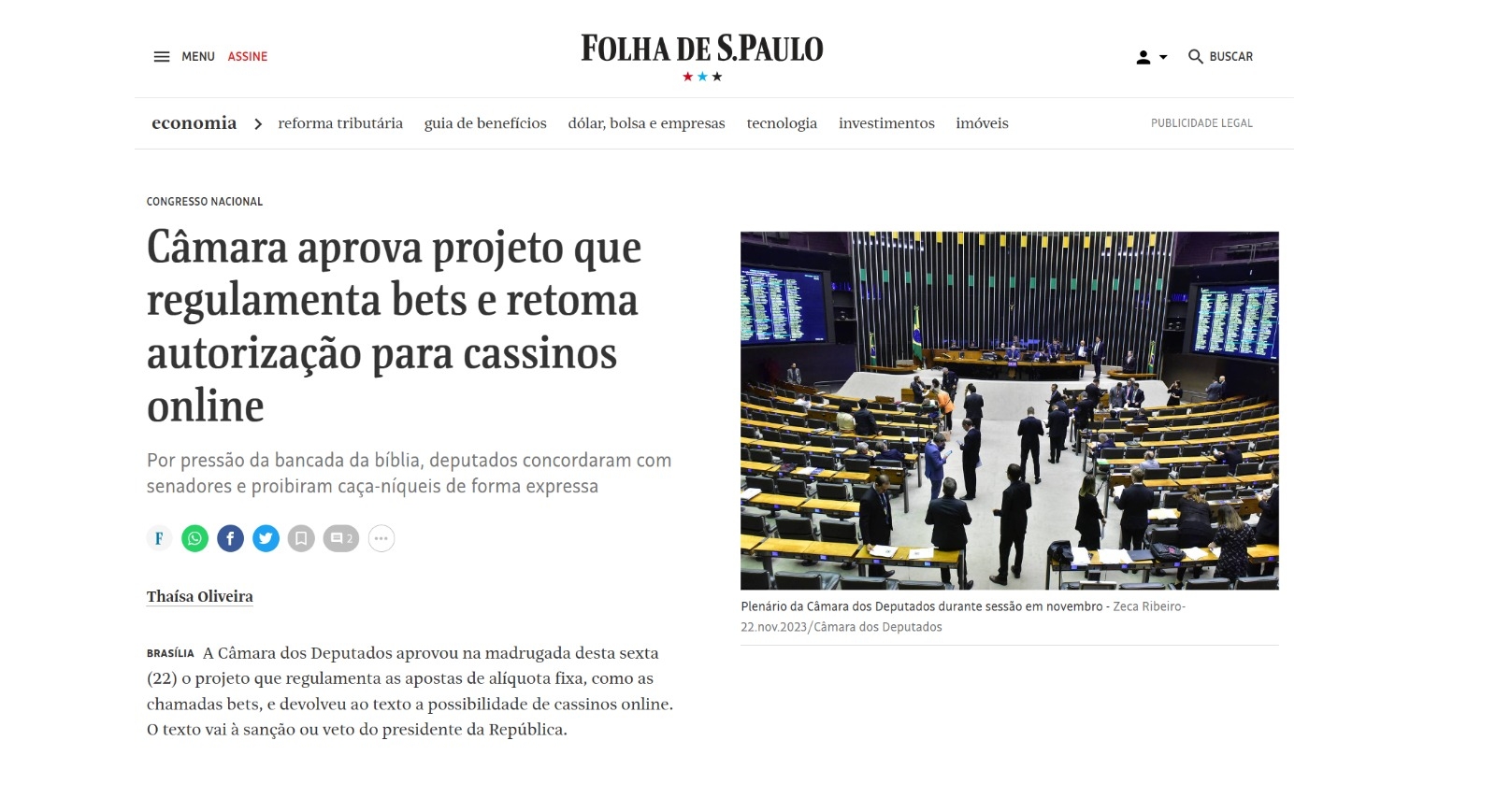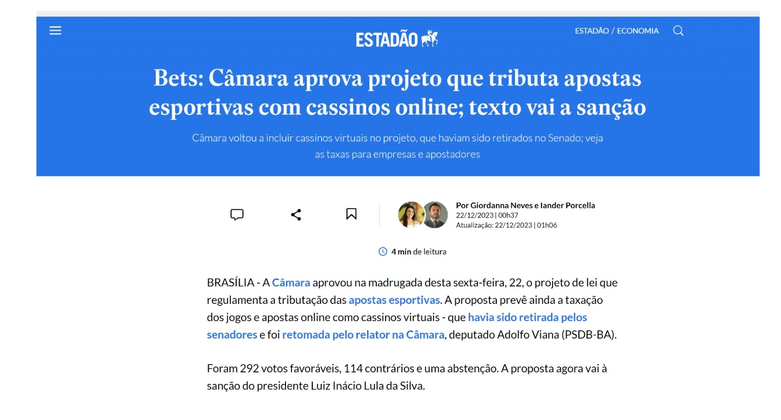O Estadão também indicou a aprovação das bets com cassino online, reforçando que a volta do cassino virtual deveu-se ao relator na Câmara, deputado Adolfo Viana (PSDB-BA).