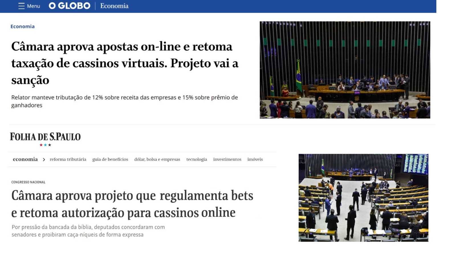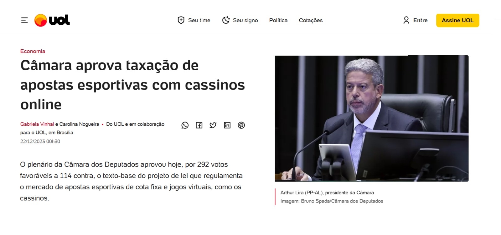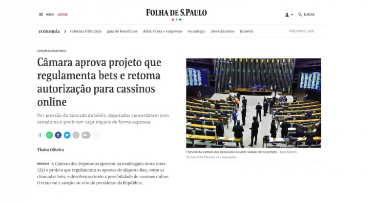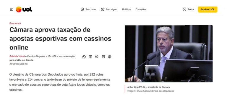 O UOL se limitou a noticiar a aprovação do projeto que regulamenta as apostas esportivas e os jogos virtuais pelo placar de 292 votos favoráveis e 114 contra.