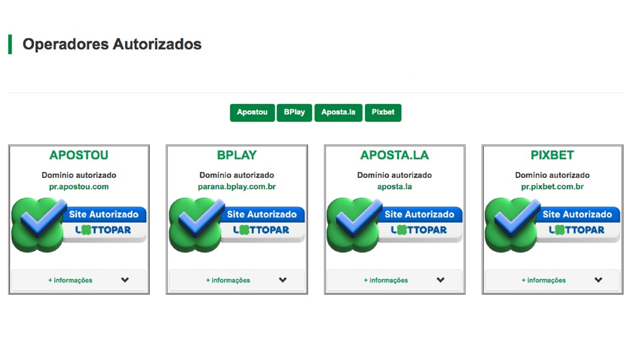As empresas autorizadas a oferecer apostas esportivas aos paranaenses são a Apostou, BPlay, Aposta.La e PixBet. No site da Lottopar é possível consultar mais informações sobre as empresas autorizadas a operar no Estado. Em caso de dúvidas sobre a operação, o site da autarquia conta também com uma página de perguntas mais frequentes relacionadas às atividades da autarquia.