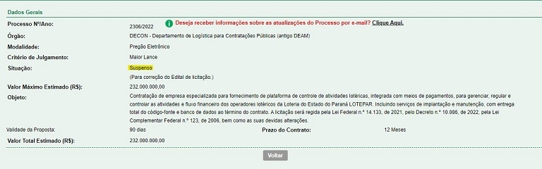 O governo do Estado do Paraná decidiu suspender a licitação para criação da plataforma que controlará as atividades lotéricas da Lotepar, incluindo as apostas esportivas, a ser concedida à iniciativa privada. O Executivo identificou a necessidade de efetuar a correção e adequação do Edital às boas práticas do mercado.