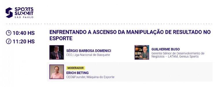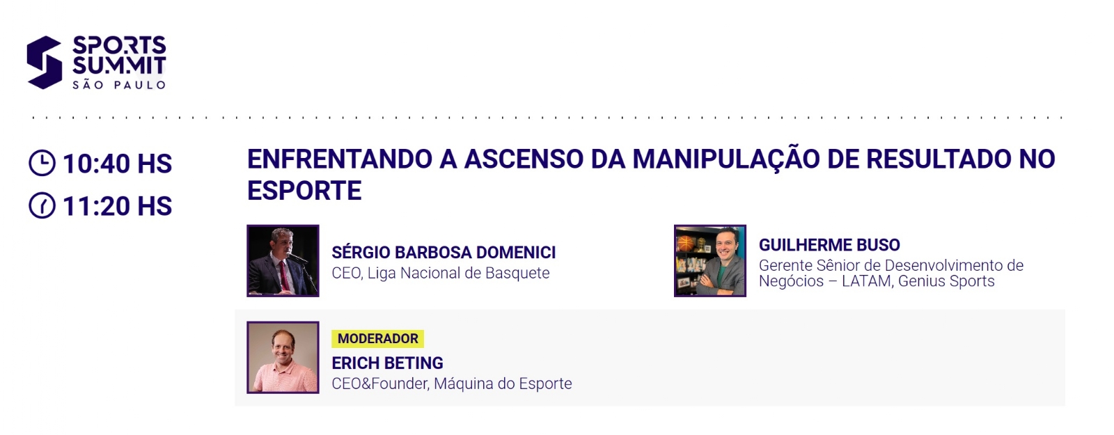 O terceiro dia (27) às 10:40 (BRT), o Sports Summit São Paulo contará com um painel especial “Enfrentando a ascensão da manipulação de resultados no esporte”, com a presença de Sérgio Barbosa Domenici, CEO da Liga Nacional de Basquete, e Guilherme Buso, gerente sênior de desenvolvimento de negócios LatAm da Genius Sports. A moderação fica a cargo de Erich Beting, CEO & Founder da Máquina do Esporte.