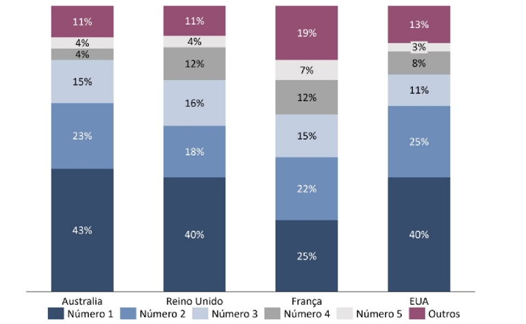 Contudo, a concentração não é apenas um fenômeno do mercado norte-americano. Basta olhar o histórico de aquisições de grandes empresas como Flutter, GVC Holdings, Entain, Playtech e Kindred Group para descobrir que elas adquiriram startups e vários outros operadores até atingir uma posição de liderança no segmento. A figura 1 mostra que a alta concentração observada nos top 4 operadores nos EUA é comum a vários outros mercados regulados, como Reino Unido, Austrália e França.