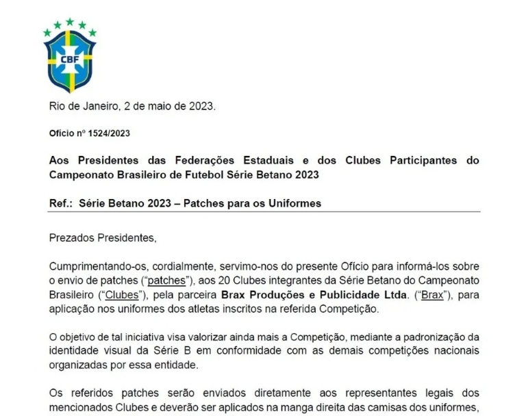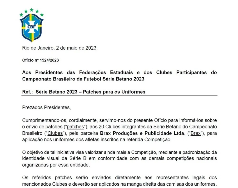 (Cópia de ofício enviado pela CBF aos clubes da Série B sobre patch — Foto: Reprodução)