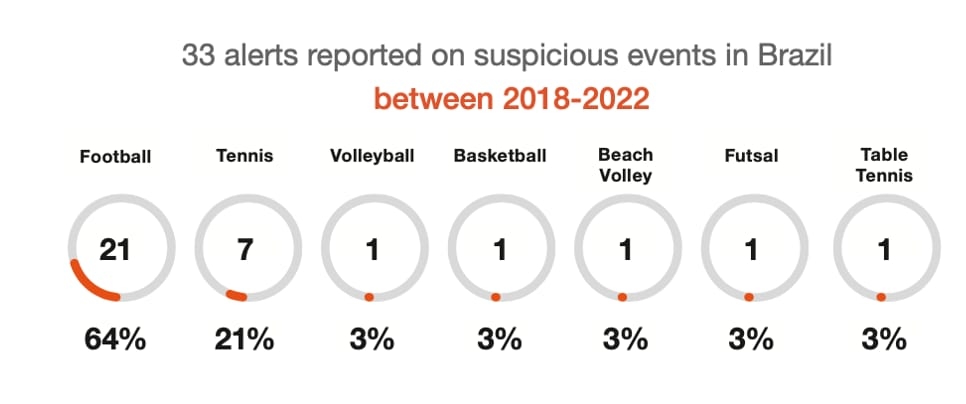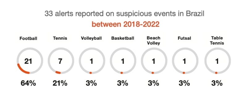 O relatório de integridade do primeiro trimestre da IBIA, publicado recentemente, contém uma análise direcionada de alertas no mercado latino-americano, com 105 alertas suspeitos em toda a região durante 2018-22. O Brasil foi a principal fonte de alertas de apostas suspeitas na América Latina (31%), com o futebol representando a maioria (61%) deles.