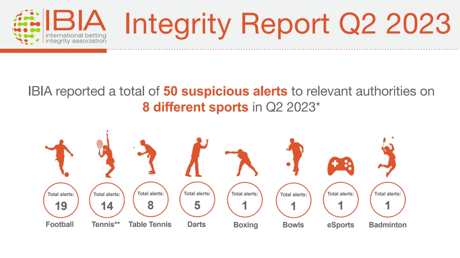 Dos 50 alertas reportados no 2º trimestre de 2023, dois estavam relacionados a eventos femininos, 47 a eventos masculinos e um a eventos mistos. A IBIA lançou recentemente um estudo inovador que analisa o tamanho e as características do mercado de apostas esportivas femininas e examina a vulnerabilidade potencial dos esportes femininos à manipulação de resultados.