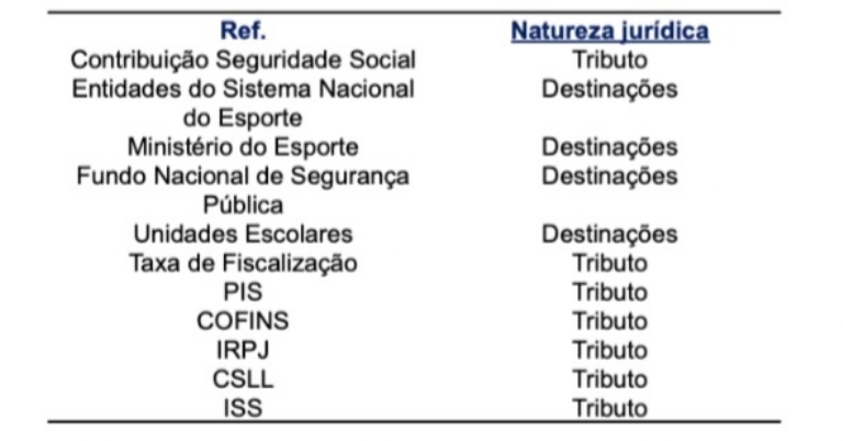 Já a contribuição para seguridade social incidente sobre a receita de concursos de prognósticos, instituída pelo art. 26 da Lei Federal 8.212/1999, ou a Taxa de Fiscalização, prevista no art. 32 da Lei 13.756/2018, são, inequivocamente, tributos. Caem na mesma categoria demais exações, como PIS, COFINS, IRPJ, CSLL e ISS: